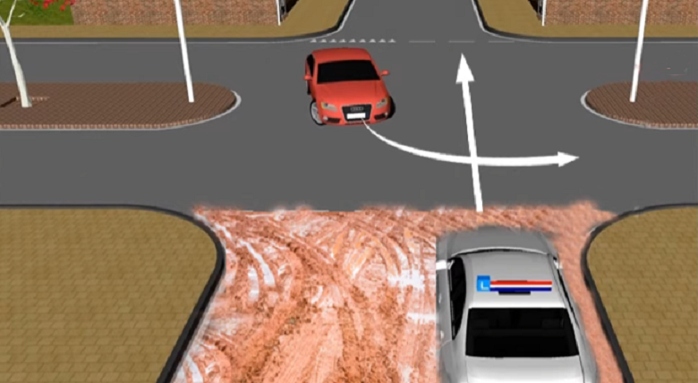 Bij dit voorrangsraadsel op een kruising met een onverharde weg denk je misschien dat de tegenligger voorrang heeft, omdat die van een verharde weg lijkt te komen en links wil afslaan. Toch zit het anders: jij, die rechtdoor wil over de onverharde weg, mag eerst.