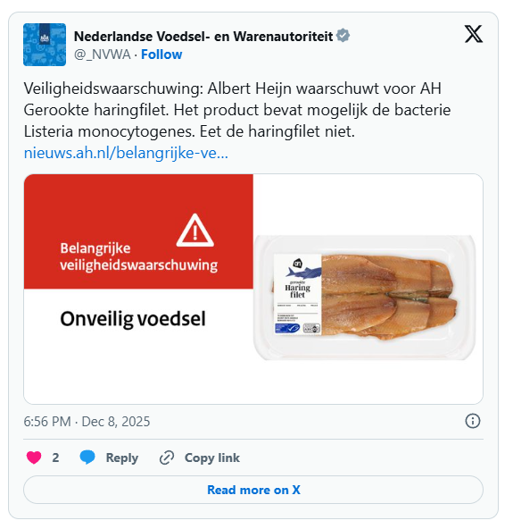 Albert Heijn vraagt je dringend om een bepaalde haringfilet thuis niet meer te eten. In het product kan de bacterie Listeria monocytogenes zitten, een ziekteverwekker die in ernstige gevallen levensbedreigend is. Zowel de supermarktketen als de Nederlandse Voedsel- en Warenautoriteit (NVWA) benadrukken: niet consumeren.