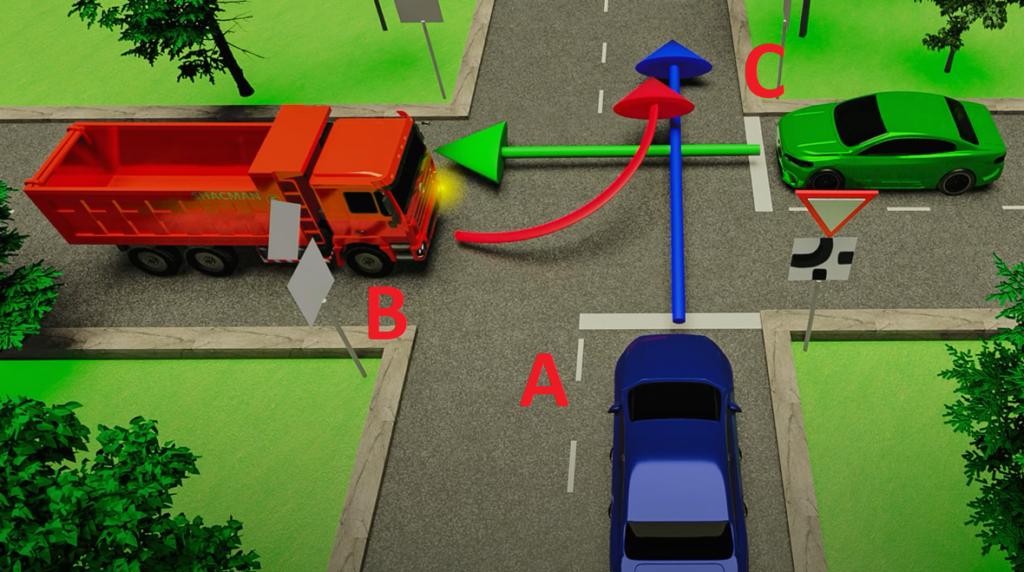 De eerste die mag rijden is de rode truck. Daarna komt de groene auto die rechtdoor gaat, gevolgd door de blauwe auto die ook rechtdoor wil.