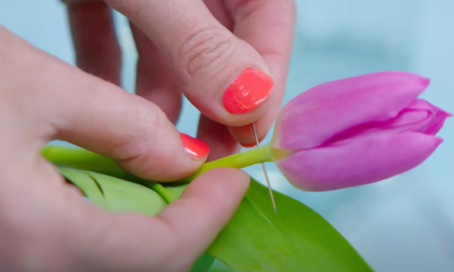 De oplossing om te voorkomen dat je tulpen hangen, is verrassend eenvoudig: gebruik een naald om een klein gaatje in de stengel van de tulp te maken, vlak onder de bloem. Dit heeft een indrukwekkend effect. Door een gaatje net onder de bloemkop te maken, stop je in feite het groeiproces van de tulp. Het gaatje verstoort het groei vermogen van de tulp, waardoor de steel stevig blijft.