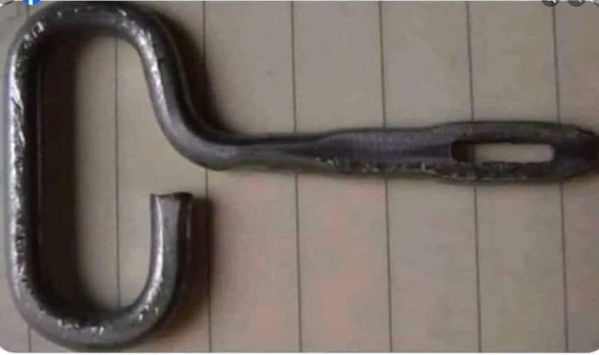 Op de foto zie je een object dat lijkt op een sleutel vanwege het metalen ontwerp. Misschien doet het je denken aan een keukeninstrument of wellicht iets uit een werkplaats. Het heeft een duidelijk handvat en een aparte bovenkant, wat doet vermoeden dat het een specifieke functie had.
