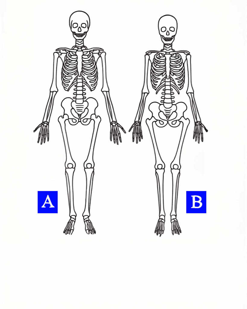 Kijk naar de illustratie met twee skeletten, A en B. Ze staan hetzelfde, de botten lijken vergelijkbaar en er valt op het eerste gezicht weinig op. Toch is er één onderdeel dat bijna altijd de doorslag geeft. Dus: welke van de twee is een vrouw?