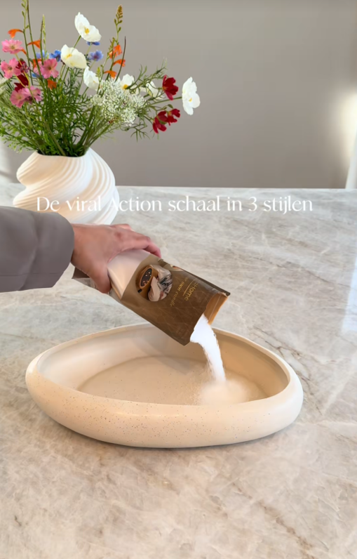 Wat ’m zo geliefd maakt, is hoe flexibel hij is. Online tonen Action-fans hoe ze de schaal vullen met fruit, kaarsen of zelfs een salade – telkens krijgt hij een totaal andere uitstraling. Het is dus niet alleen decoratie, maar een item dat je helemaal naar je eigen smaak kunt inzetten.