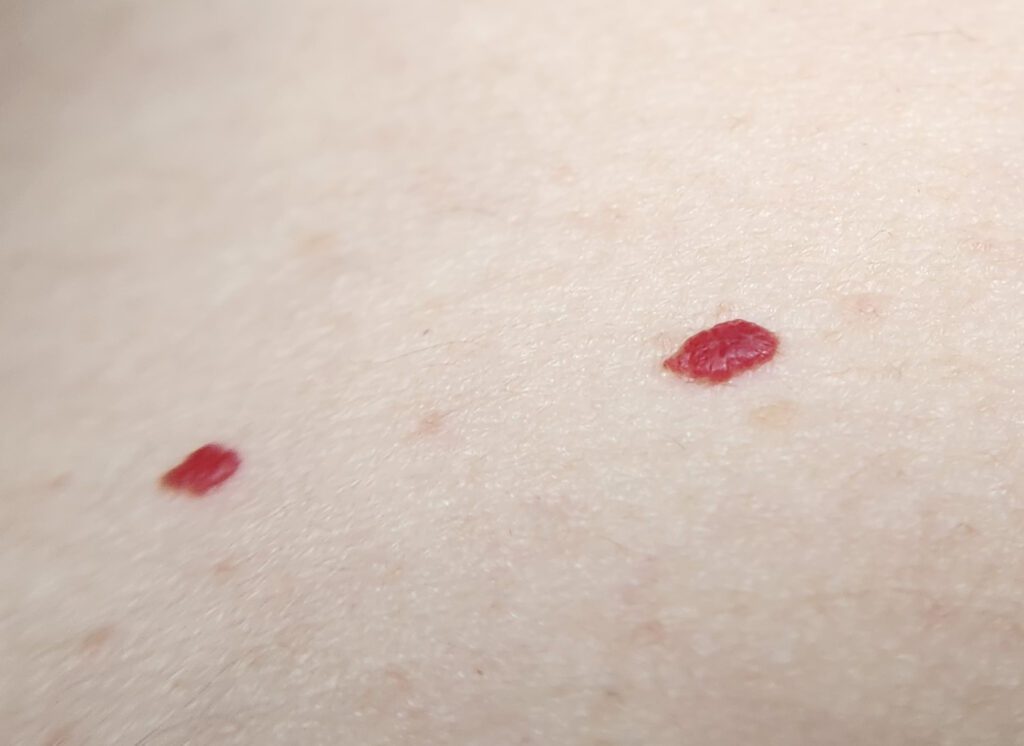 Die rode vlekjes zijn eigenlijk kersenangiomen. Ze bestaan uit kleine bloedvaatjes, wat hun rode kleur verklaart. Deze goedaardige huidtumoren houden verband met ouder worden en het risico neemt toe met de leeftijd. Kersenangiomen, ook bekend als Campbell de Morgan-vlekken of seniele angiomen, zijn de meest voorkomende angiomen, veroorzaakt door de overmatige groei van haarvaatjes.
