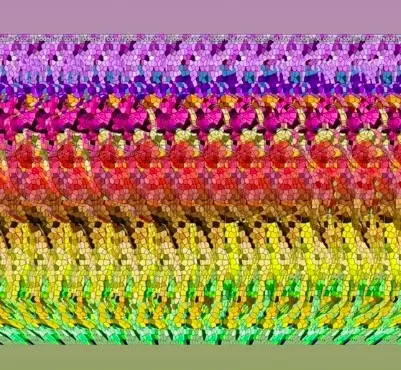 In werkelijkheid is deze illusie een autostereogram, een tweedimensionale foto met herhalende elementen, waarin een driedimensionale vorm verborgen ligt. Bij een eerste blik neemt je brein de afbeelding op zonder iets anders te onderscheiden dan de herhalende 2D-elementen. Hierdoor concentreert je zicht zich op de overvloed aan kleuren in de afbeelding, zonder enige diepte te zien.