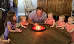 InternetZusjes zingen voor papa’s verjaardag, maar let op zijn dochtertje naast hem bij het uitblazen van de kaars