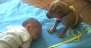 Verbazingwekkende reactie van puppy op slapende baby vastgelegd door moeder